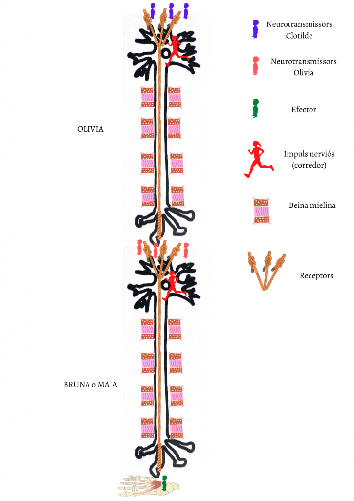 En el nostre joc, els receptors estan representats per uns nusos que es troben en 3 bufandes diferents i que a la vegada estan lligades a la corda que veieu. Els neurotransmissors (molècules que transmeten informació en el sistema nerviós) de la Clotilde (una neurona ja experta en fer la seva funció) es troben a l’espai sinàptic (lloc que separa dues neurones) i volen arribar a la fissura sinàptica (zona de membrana amb els receptors) de les neurones Lola i Olivia. Quan el o la professor/a digui: endavant!, tots els nois/es que fan de neurotransmissors de la Clotilde (sereu 3 persones de cada grup), hauran de córrer cap a la fissura sinàptica de la neurona Lola o Olivia (segons el grup que els hagi tocat). A la part de fora de la neurona, hi haurà preparades les 3 bufandes amb un nus a cada una .