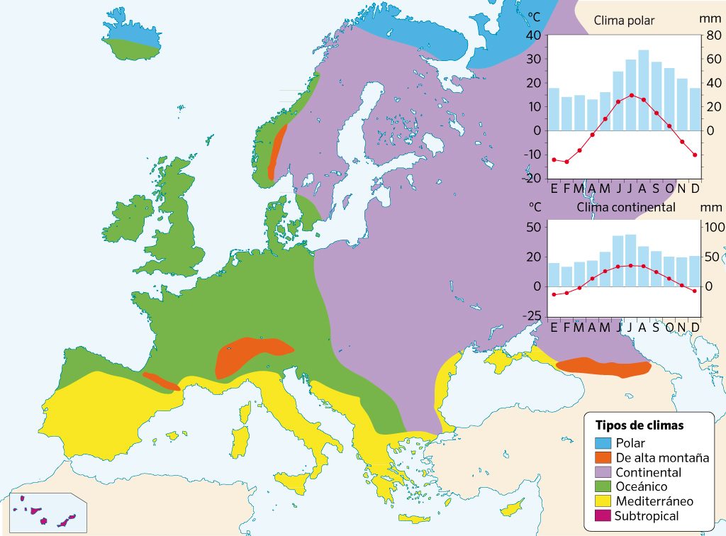 Dels diversos climes temperats que apareixen al mapa, a Europa hi ha els següents: