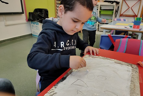 Hem dibuixat línies, formes geomètriques…ho hem fet amb bastonets de cotó sobre paper d’alumini pintat amb pintura blanca, després hi hem estampat una cartolina a sobre i mireu com ens ha quedat! Oi que és bonic? Som uns artistes! Fotos