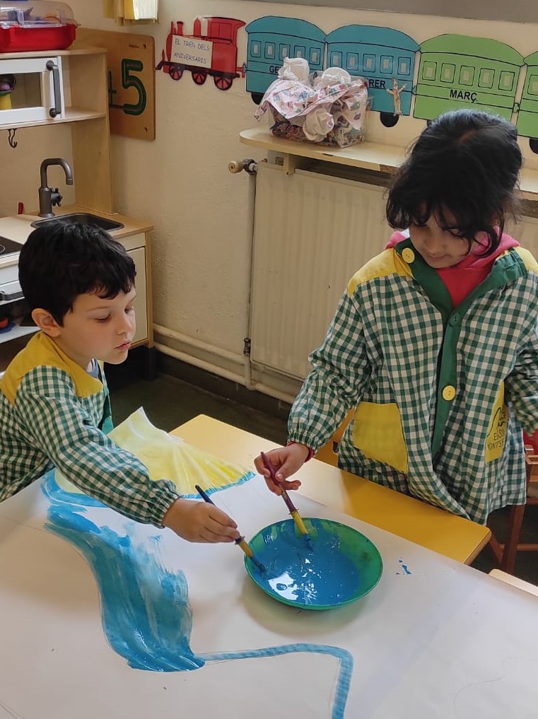 Vam pintar un paisatge on es pot veure el mar, una carretera, una via i l’aire… Mentre uns infants pintaven el paisatge altres pintaven diferents transports. Després els vam enganxar on corresponien, treballant així els diferents medis: aeris, terrestres i aquàtics. FOTOS