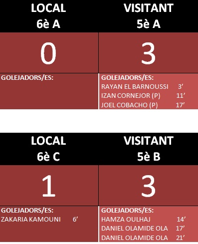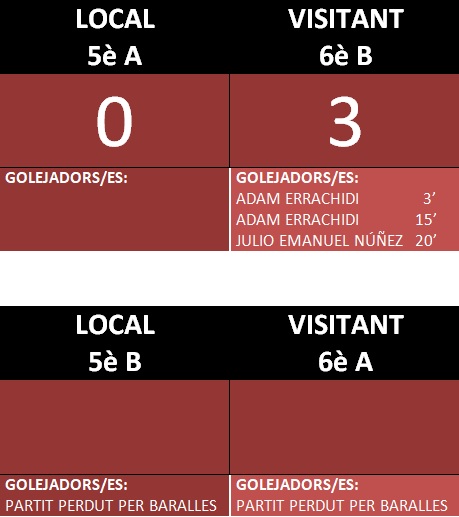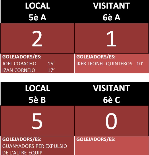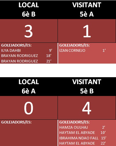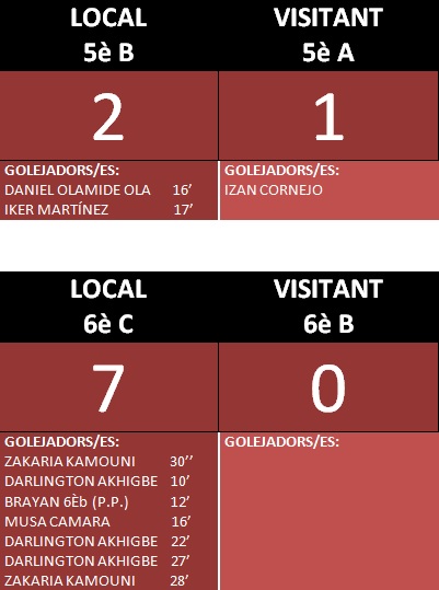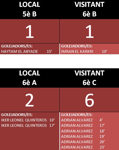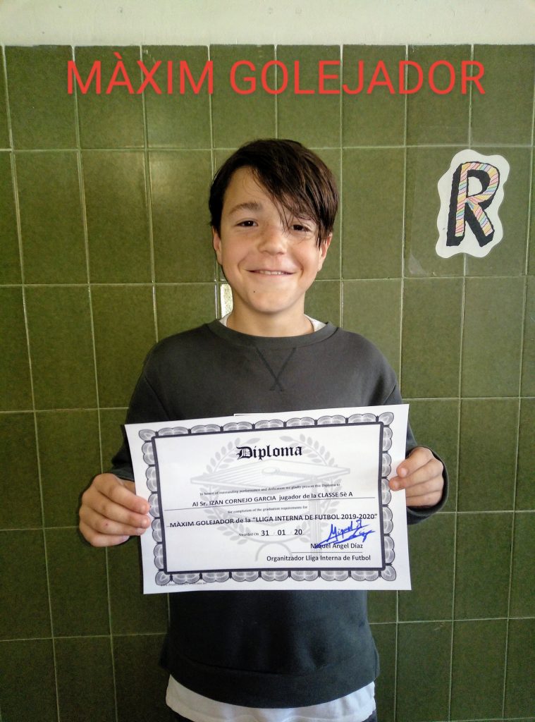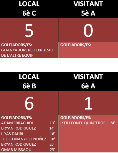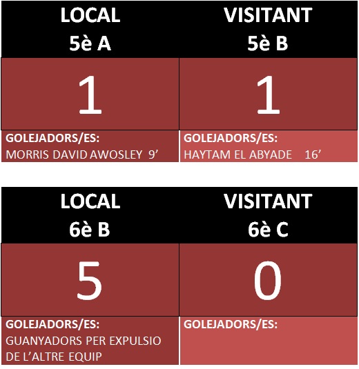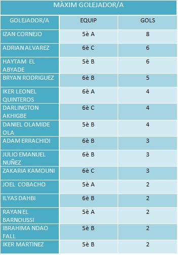 I ara si després de tots aquest resultats tenim com a campions de la LLIGA INTERNA DE FUTBOL DE L’ESCOLA BONAVISTA LA CLASSE DE 5è B i un cop finalitzada la competició també tenim modificacions a la taula de màxim golejador i coma pitxixi ha quedat un jugador de equip de 5è A