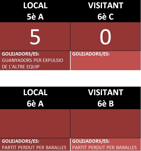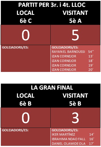 Quan acabi el doble triangular, es penjaran els resultats totals amb els màxims/es golejadors/es i es publicarà quin dos equips passaran a jugar la GRAN FINAL DE LA COPA DE LA SRA. DIRECTORA.