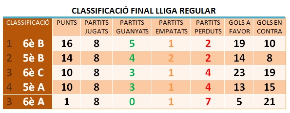I la CLASSIFICIÓ FINAL de la lliga regular després de tots aquests partit tant d’anada com de tornada, ha quedat: