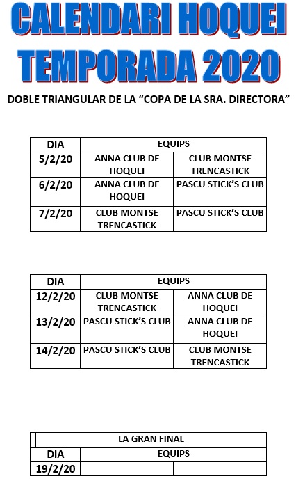 Avui dia 6 de febrer del 2020 ha de començar per primera vegada en la història un Doble-Triangular, per fer la final de Hoquei de la “Copa de la Sra. Directora” de la temporada 2020, on tres equips “ANNA CLUB DE HOQUEI“, “CLUB MONTSE TRENCASTICK” iPASCU STICK’S CLUB” intentaran fer-se amb el trofeu que en la passada edició va assolir els “IRENE CLUB DE HOQUEI