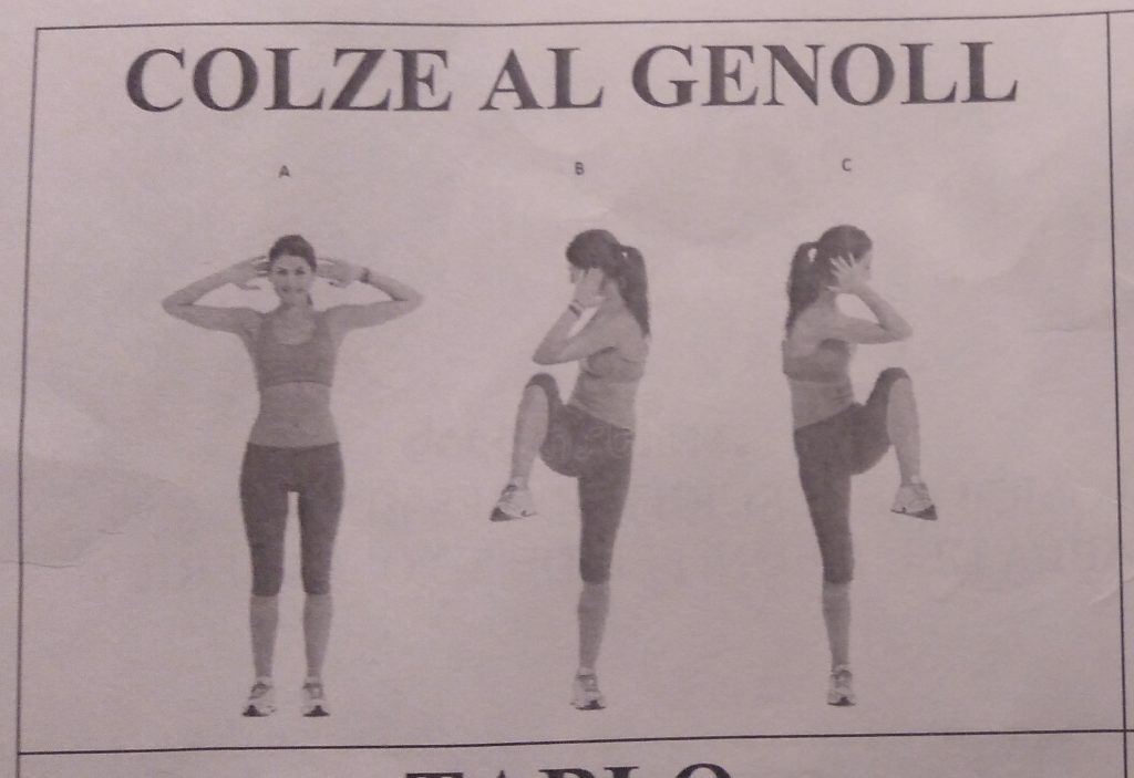 Exercici de coordinació on s’ha de tocar amb el colze al genoll contrari (és a dir: colze dret tocar amb el genoll esquerra i colze esquerra tocar amb el genoll dret), així realitzant l’exercici sense doblegar l’esquena.