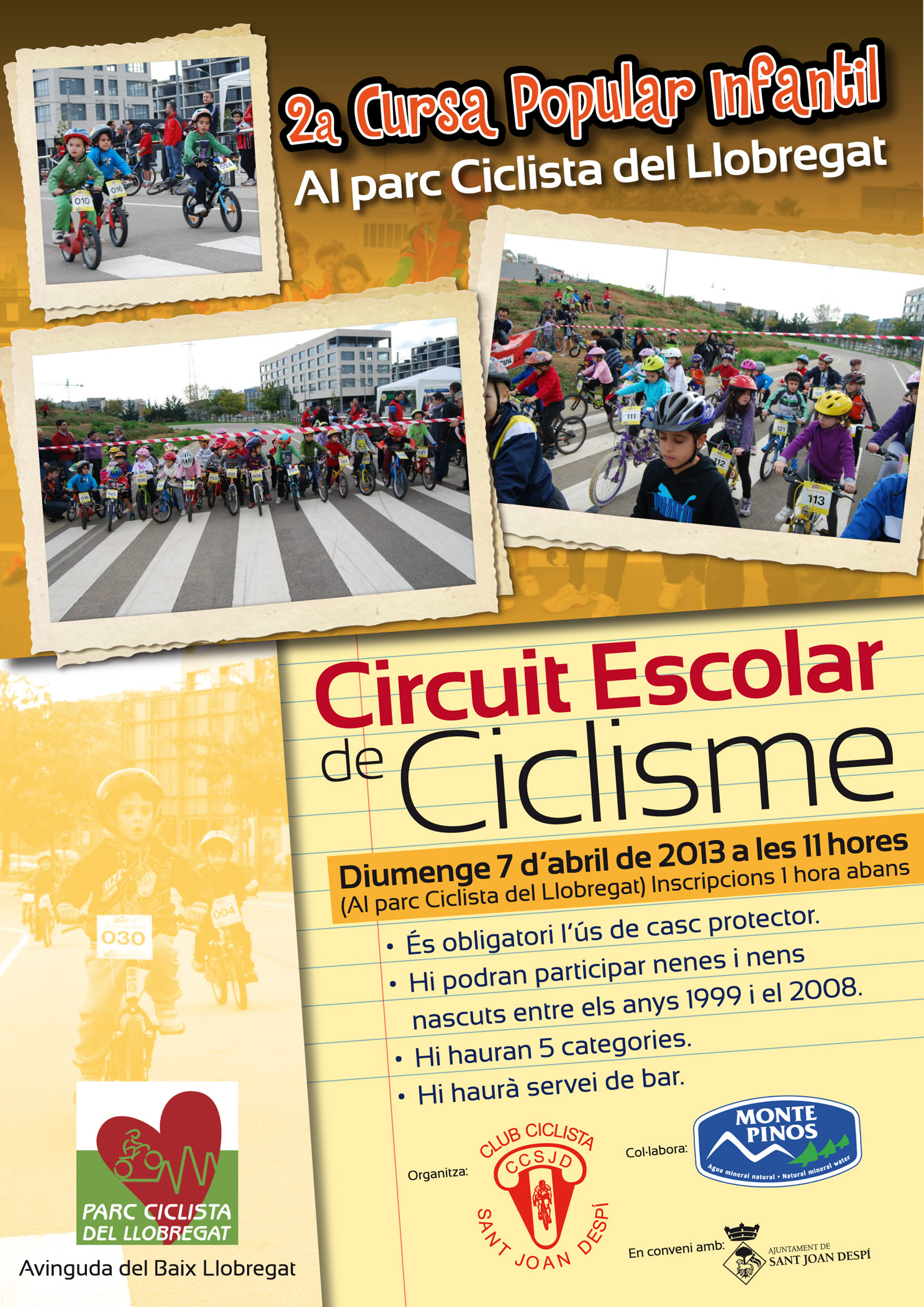 Ens plau presentar-vos una nova proposta: 1a Cursa del Circuit Escolar de Ciclisme que es realitzarà el diumenge 7 d’abril a partir de les 11h al Parc Ciclista del Llobregat (Av. del Baix Llobregat).