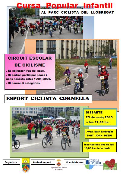 Ens plau presentar-vos la 2a Cursa del Circuit Escolar de Ciclisme que es realitzarà el dissabte 25 de maig a partir de les 17h al Parc Ciclista del Llobregat (Av. del Baix Llobregat).