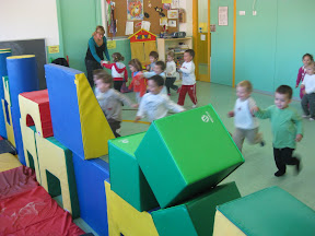Habitualment comencem les sessions de psicomotricitat fent caure la muralla. Així, tirant a terra aquest mur de coixins, l’infant fa una descàrrega motriu que donarà pas al joc motor i simbòlic.