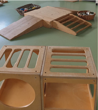 A part d’aquests materials també es fa servir una tarima amb rampes de fusta, perquè els infants desenvolupin la psicomotricitat, a més d’uns mòduls que es poden arrossegar.
