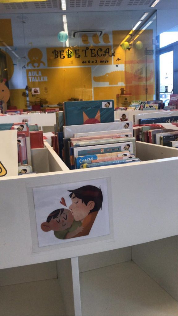 Els contes es diferencien amb gomets de colors, per exemple, el gomet blau està als llibres dels infants de 0-6.