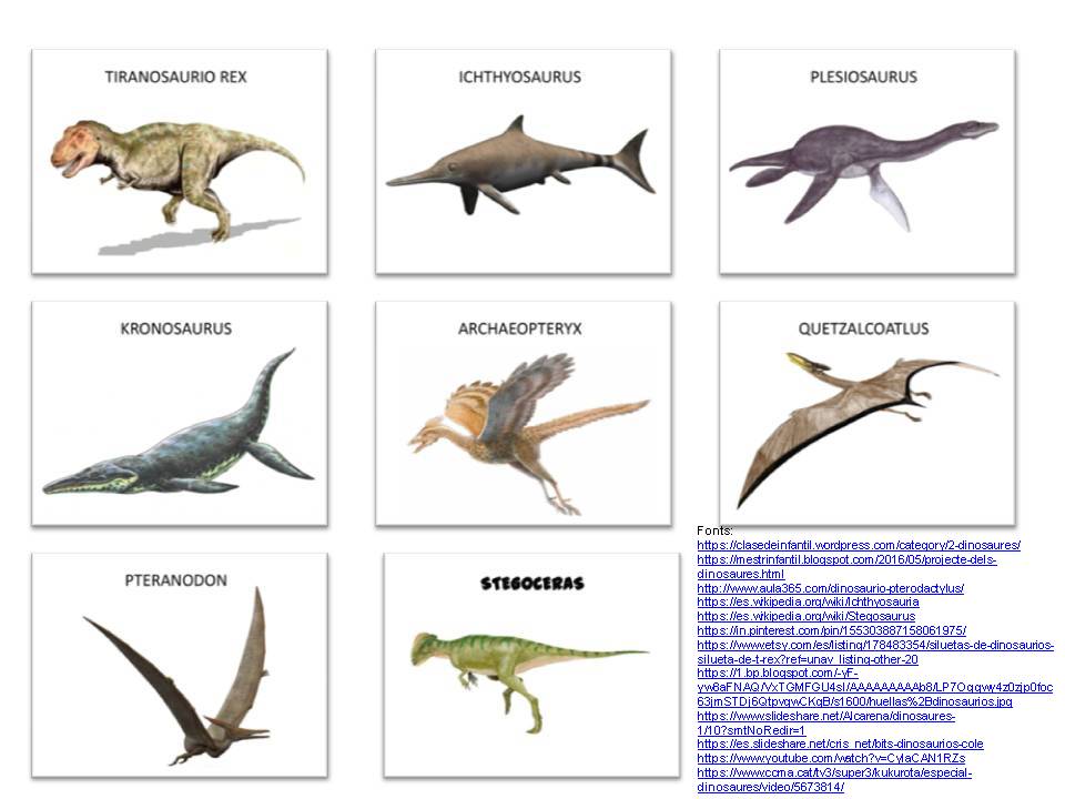 - Fitxes per treballar en la PDI: aquestes fitxes són per arrossegar nom i dibuixos en el seu lloc.: Ordenar les parts de diferents dinosaures, què mengen, on viuen, com neixen, com van desaparèixer i ordenar de més gran a més petit.