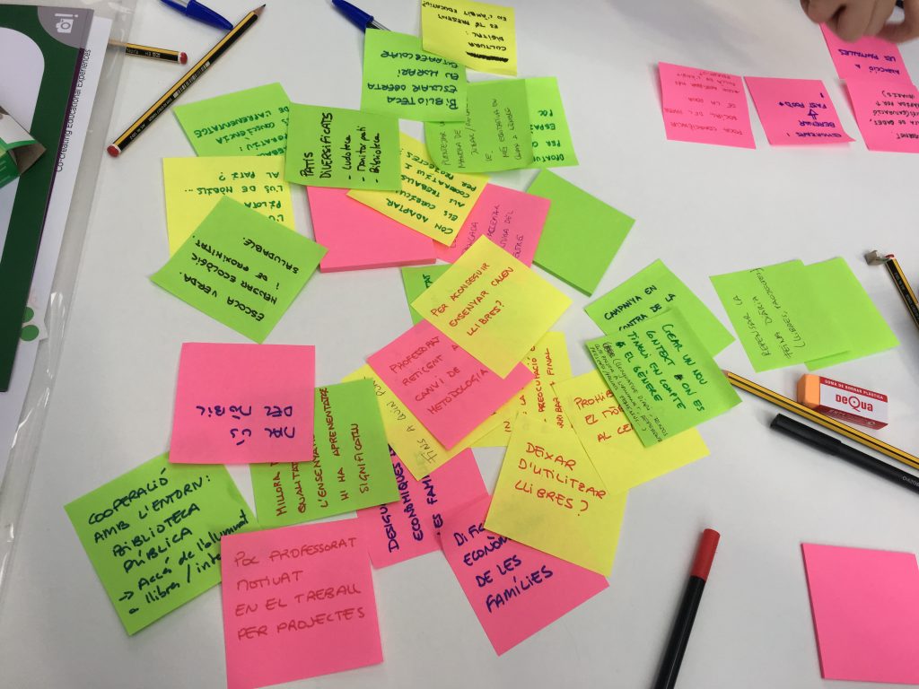 En aquest punt del procés ens toca identificar problemàtiques i oportunitats. Per fer-ho fem servir pòstits de diferents colors, rosa per definir aspectes negatius o problemàtiques, verd per destacar aspectes positius o oportunitats i groc per posar-hi aspectes que ens generen dubtes.
