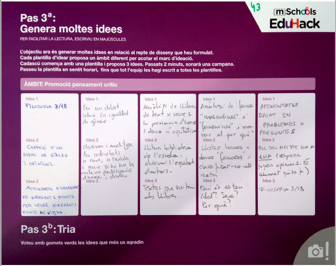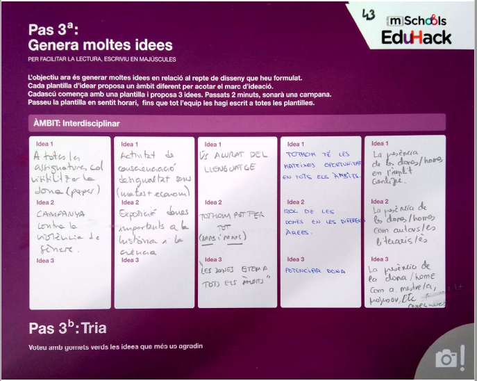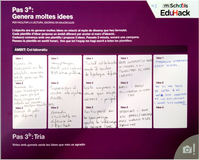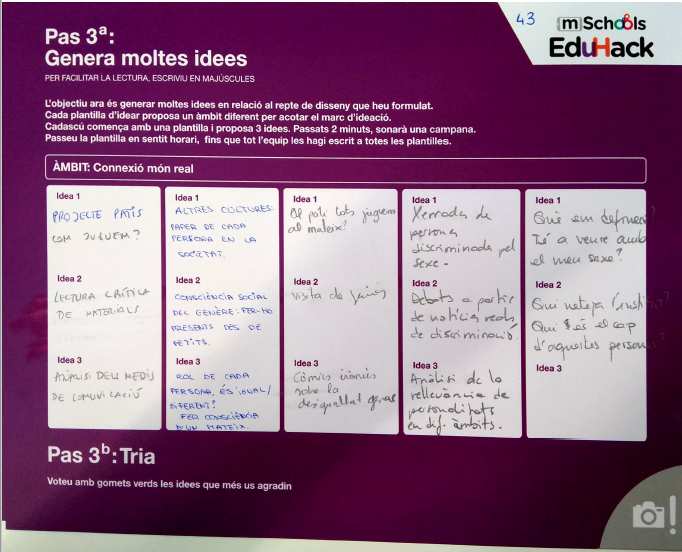 En aquesta fase hem de generar moltes idees en poc temps. Per fer-ho tenim dos minuts cada una per redactar 3 idees en cada un dels àmbits.