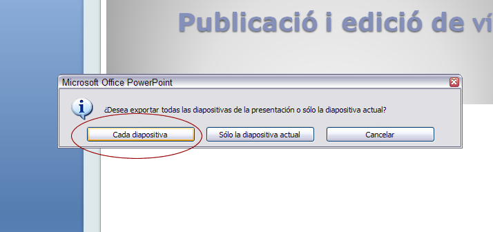 4. Feu clic sobre el botó Guardar. Apareixerà una finestra amb un text demanant-vos si voleu guardar totes les diapositives o només l’actual. Feu clic sobre el botó Cada diapositiva.