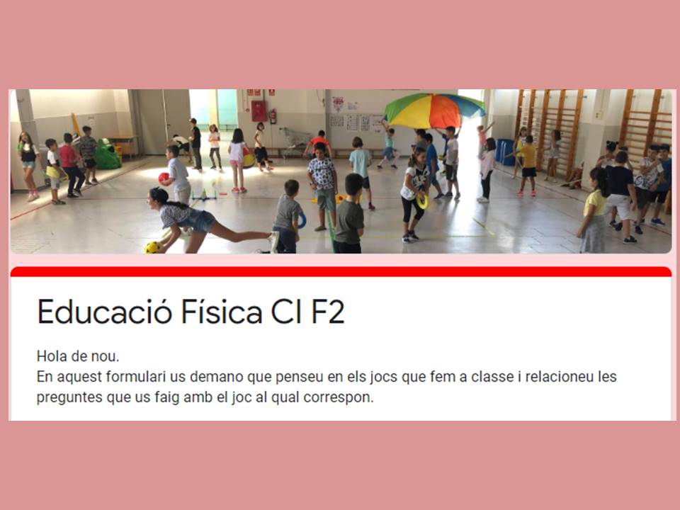- Cicle Inicial: Us adjunto un formulari basat en els jocs que fem a classe. Us plantejo unes preguntes i heu de contestar amb el joc al qual fan referència. Educació Física CI F2