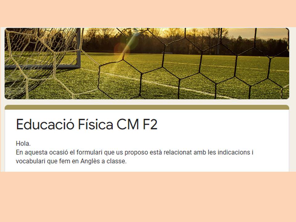 - Cicle Mitjà: En aquesta ocasió el formulari que us proposo està relacionat amb les indicacions i vocabulari que fem en Anglès a classe.Educació Física CM F2