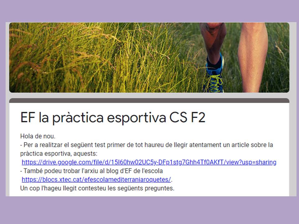 - Cicle Superior: Us adjunto l’arxiu del Google forms. Per completar el formulari prèviament heu de llegir amb atenció el següent document “La pràctica esportiva”. Un cop l’hageu llegit podreu resposta el breu qüestionari. Educació Física CS F2.