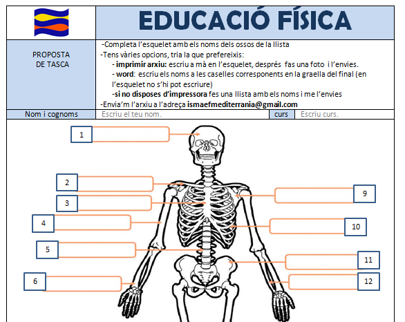 - CICLE SUPERIOR: us adjunto un arxiu word per tal de completar les parts del cos. Podeu consultar qualsevol font d’informació, per exemple aquesta Viquipèdia: llista d’ossos del l’esquelet humà. Fixa’t en que hi ha dos tipus d’arxiu, per fer a mà o bé per fer a ordinador. En cas de no disposar d’impressora pots fer una llista a mà i enviar-me-la. En els tres casos el mail per enviar la fitxa és el mateix ismaefmediterrania@gmail.com. Quan m’envieu la fitxa jo us enviaré el solucionari, així podreu comprovar els encerts.