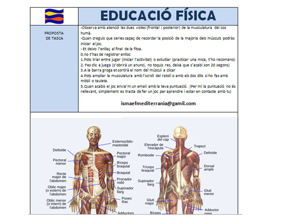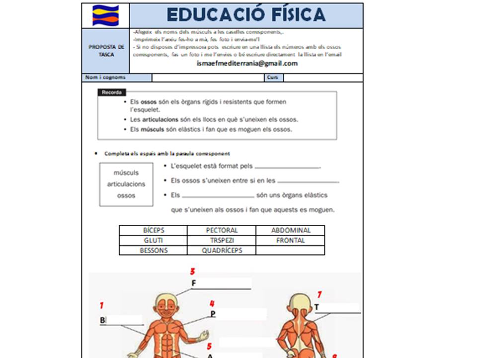 IMPRIMIR: descarregar i imprimir, fer a mà la fitxa tasca musculatura CI , enviar la vostra feina a l’adreça ismaefmediterrania@gmail.com ,quan m’envieu la tasca us enviaré la fitxa amb les respostes per a que pugueu comprovar com ho heu fet.