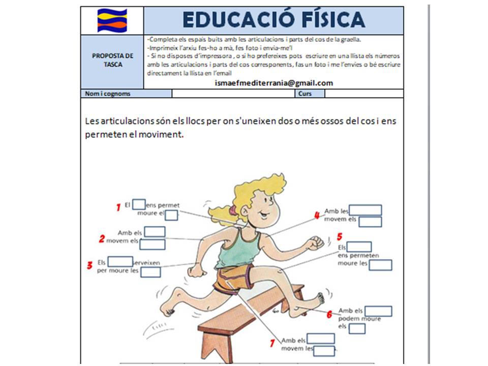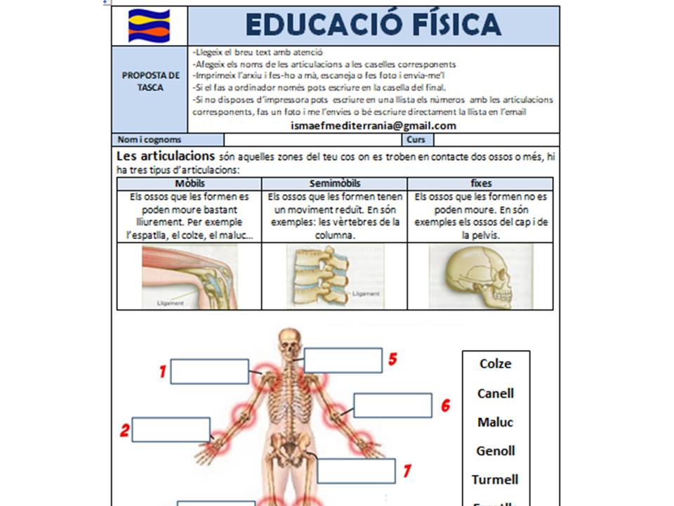 - PER IMPRIMIR I FER A MÀ: Descarrega i imprimeix la fitxa tasca articulacions CM IMPRIMIR I FER A MÀ. Un cop la tinguis feta envia-me-la a la següent adreça ismaefmediterrania@gmail.com, Aleshores t’enviaré l’arxiu amb les respostes per tal que puguis comprovar com ho has fet. La nota no és rellevant, simplement es tracta de fer una fitxa per seguir aprenent i estar en contacte.