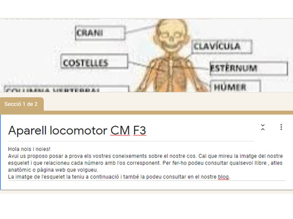 - CICLE MITJÀ: com en ocasions anteriors us he preparat un formulari sobre els ossos del nostre cos. Cal que mireu la imatge que us penjo aquí amb atenció (si feu clic s’obre un enllaç que us pot ajudar per fer el formulari) i després contestar les 11 preguntes. En tot moment podeu consultar qualsevol llibre, atles anatòmic, web, pare, mare, gos gat…. Quan hagueu acabat jo rebré una notificació automàtica, per tant no cal que m’envieu cap e-mail . La nota no té importància, es tracta de treballar i aprendre.