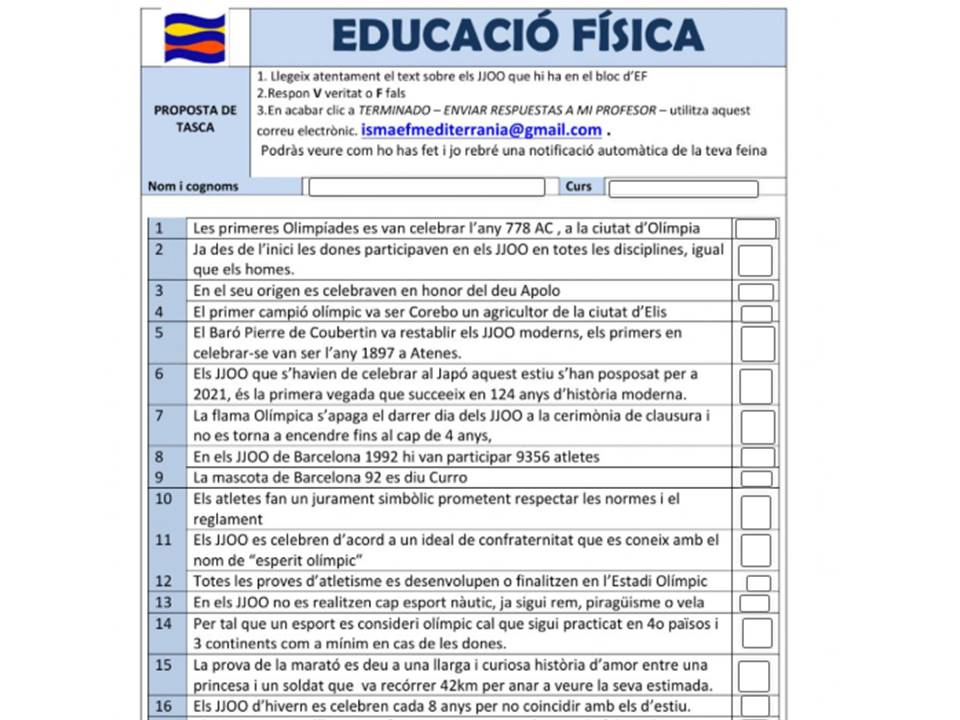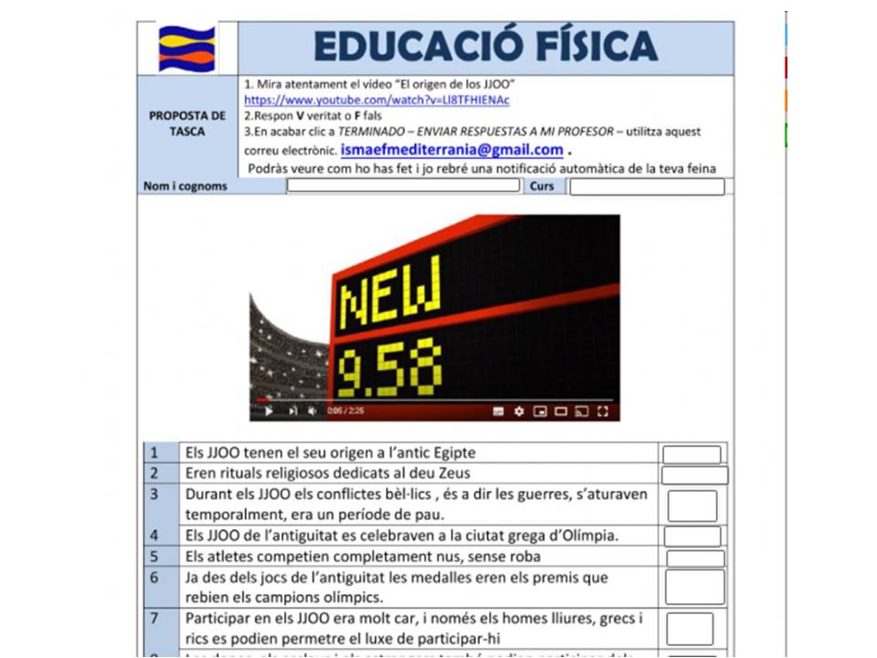 CICLE MITJÀ (3r i 4t): Us proposo que visualitzeu amb atenció un breu vídeo sobre l’origen de les Olimpíades i que a continuació contesteu amb V (verdader) o F (fals) un breu qüestionari online. És aquests liveworksheets qüestionari CM online . En acabar clic a TERMINADO – ENVIAR RESPUESTAS A MI PROFESOR, fent servir la meva adreça ismaefmediterrania@gmail.com. Podreu veure el resultat de la vostra feina i jo rebré una notificació automàtica. Per tant no és necessari que m’envieu res.