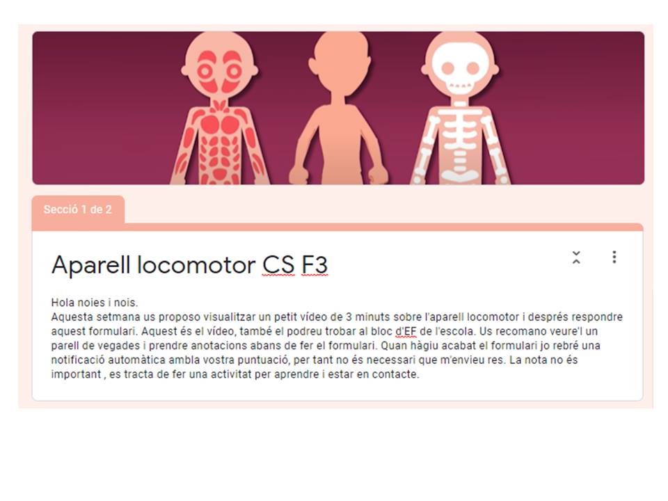 CICLE SUPERIOR (5è i 6è): Us proposo que mireu amb atenció el següent vídeo (són 3 minuts) i després contestar el formulari Aparell locomotor CS F3 que us he preparat. Quan el contesteu podreu veure la vostra puntuació i jo rebré una notificació automàtica, per tant no cal que m’envieu res.La puntuació no és rellevant, simplement es tracta de fer una fitxa per seguir aprenent i estar en contacte.