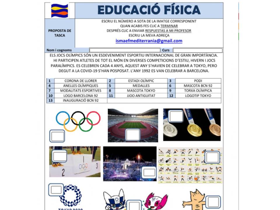 CICLE INICIAL (1r i 2n): Us proposo conèixer els símbols olímpics, de ben segur que alguna vegada els heu vist. Obriu aquests arxiu per fer la tasca online liveworksheets símbols JJOO . Cal que escriviu el número que correspon a cada símbol. En acabar clic a TERMINADO – ENVIAR RESPUESTAS A MI PROFESOR, fent servir la meva adreça ismaefmediterrania@gmail.com. Podreu veure el resultat de la vostra feina ,i jo rebré una notificació automàtica. Per tant no és necessari que m’envieu res.