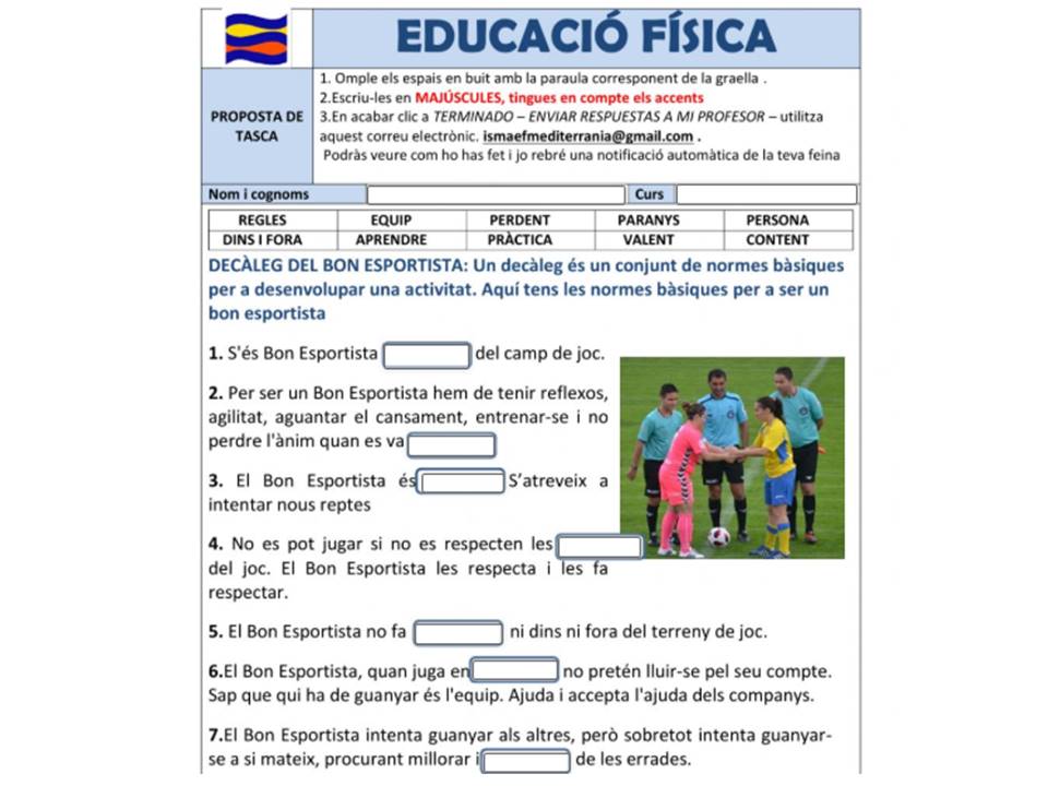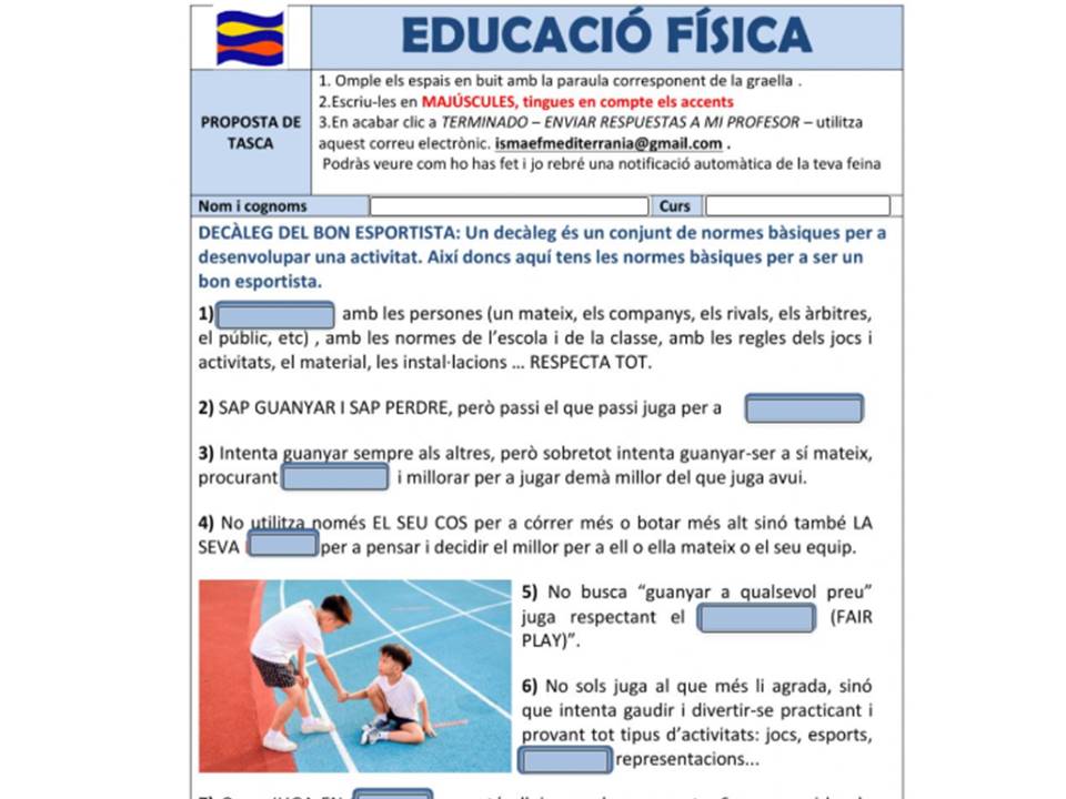 CICLE SUPERIOR (5è i 6è): Hi ha dos arxius, en funció si el vols fer l’activitat online liveworsheets decàleg bon esportista CS online, quan acabis fes clic a TERMINADO.ENVIAR RESPUESTAS A MI PROFESOR, introdueix la meva adreça ismaefmediterrania@gmail.com jo rebré una notificació automàtica del teu treball i tu podràs veure’n el resultat.