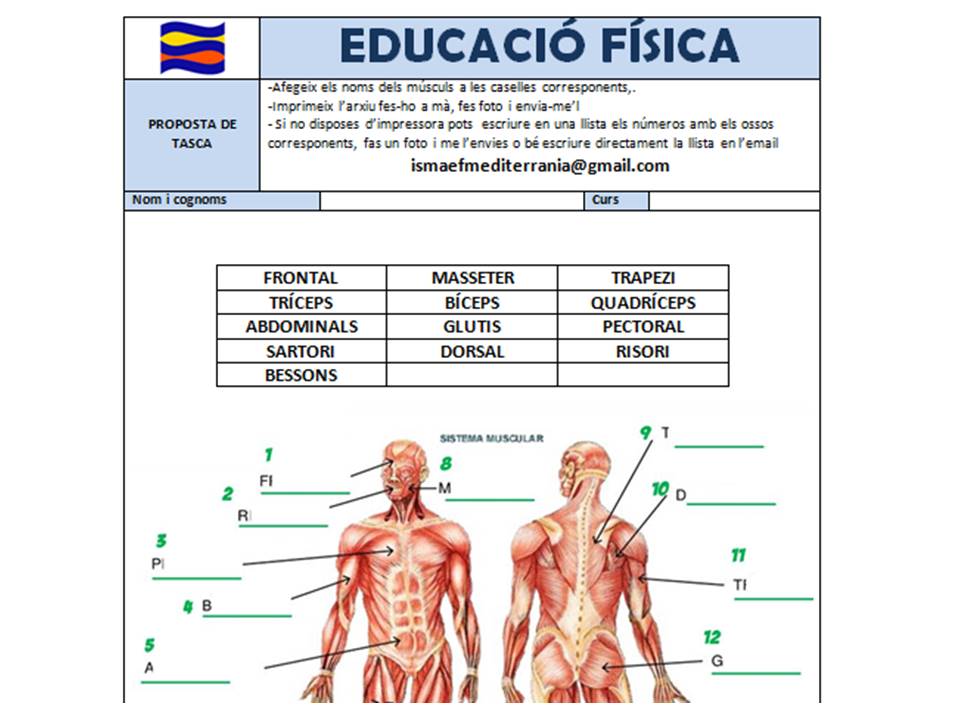 IMPRIMIR: descarregar i imprimir, fer a mà la fitxa tasca musculatura CI , enviar la vostra feina a l’adreça ismaefmediterrania@gmail.com ,quan m’envieu la tasca us enviaré la fitxa amb les respostes per a que pugueu comprovar com ho heu fet.