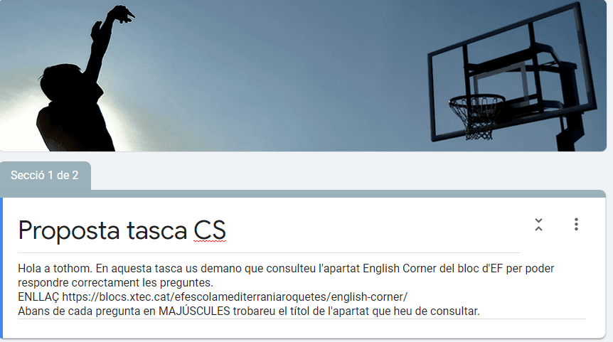 Aquesta setmana us proposo un formulari sobre les indicacions que donem en Anglès a EF. Feu clic a l’enllaç i contesteu les 10 preguntes del test. Al final podreu veure la puntuació obtinguda, només es permet fer el test un cop per alumne, per tant llegiu i penseu bé abans de respondre, amb tot es tracta d’un joc, la puntuació només és orientativa i relacionada amb la vostra atenció a classe. Per fer-lo caldrà que consultis l’English corner d’aquest bloc, tens l’enllaç dins el formulari.