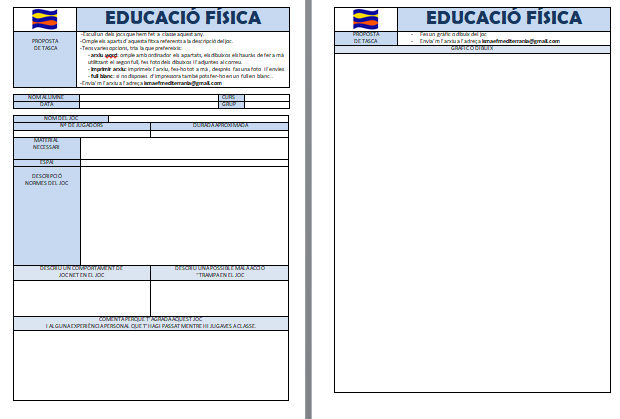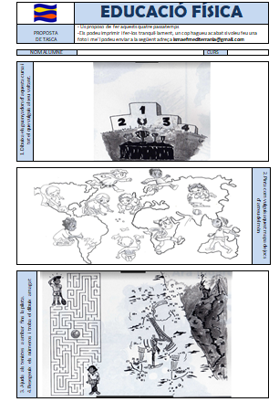 Us adjunto la segona proposta de tasca. Degut que la nostra classe és 100% pràctica i vivencial es tracta d’activitats alternatives a la nostra sessió d’EF habitual a l’escola, així doncs no hi ha un termini de realització ,tanmateix agraeixo molt la seva realització i els correus electrònics que m’esteu enviant.