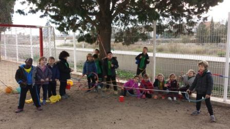 Amb els alumnes de P5 i 1r comencem la sessió d’Educació física corrent una mica quan fem l’escalfament i després fem algun joc. En aquesta sessió després vam fer racons i vam jugar amb material divers.