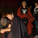 El dia de l’estrena hem destinat força temps als preparatius. És la primera vegada que tindrem públic al davant i cal estar ben organitzats. Projecció de vídeos, música, decorats, vestuari, atrezzo, una bogeria… Tots col·laboren en les tasques depreparació. L’hora s’acosta. L’obra la representem davant d’uns vuitanta espectadors. Són alumnes de segon d’ESO. Ningú ha pensat en les fotos. Ens aniria bé tenir un registre fotogràfic de les actuacions. La Sílvia s’hi posa. I aquest és el petit reportatge improvisat del dia de la nostra estrena.