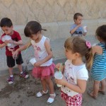 El divendres passat a la tarda els alumnes de P4 vam sortir al pati disposats a fer un munt de bombolles: un got ple d’aigua, una mica de sabó, una palleta… i a bufar!