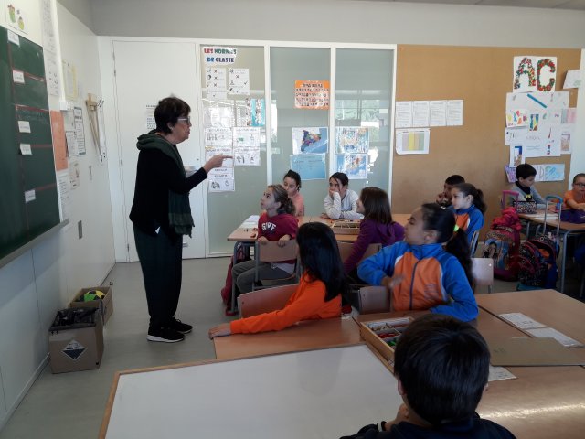 Després de fer l’activitat al pati de línies paral·lels i línies secants, dos alumnes expliquen a la resta de companys/es el que van aprendre.