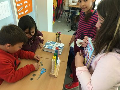 Els alumnes de 3r, estem treballant l’ús del sistema monetari: l’euro i els cèntims. Per aquest motiu, en algunes sessions, convertim l’aula en un mercat i els alumnes passen a ser clients i venedors. A partir d’aquesta activitat fem èmfasi en les diferents operacions que sorgeixen a l’hora de pagar i donar el canvi en un context gairebé real. Alhora també es dóna molta importància a les formes que s’utilitzen pel que fa la comunicació oral a l’hora d’anar a comprar a una botiga.