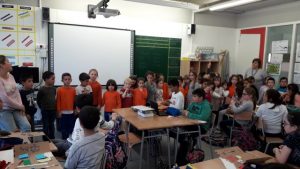 Ens han rebut amb un munt de sorpreses. Hem pogut participar en l’elaboració d’un lipdub a ritme de la cançó Caminem lluny i tot transportant un pastís que ens recordava que el primer intercanvi es va fer ara fa 20 anys a la mateixa escola. Després un bon esmorzar al pati per agafar forces