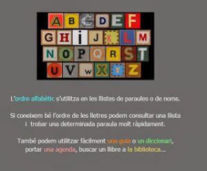 L’ordre alfabètic és un sistema que ens permet ordenar les paraules prenent com a referència l’alfabet o abecedari. Per ordenar les paraules cal posar primer aquelles el nom de les quals comencin per la primera lletra de l’abecedari. Quan hi hagi paraules que comencin amb la mateixa lletra, es tindrà en compte la segona i així successivament.