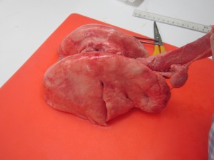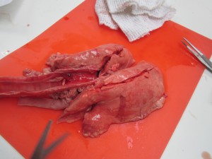 Primer vam posar el pulmó en la posició correcta per a disseccionar molt millor el pulmó. Seguidament vam preparar el material necessari, que era: unes tisores, unes pinces… Després vam començar a observar com s’inflava el pulmó. Vam explicar com i perquè s’inflava. Després d’observar i apuntar dades sobre com reaccionava el pulmó de bè vam començar a disseccionar.