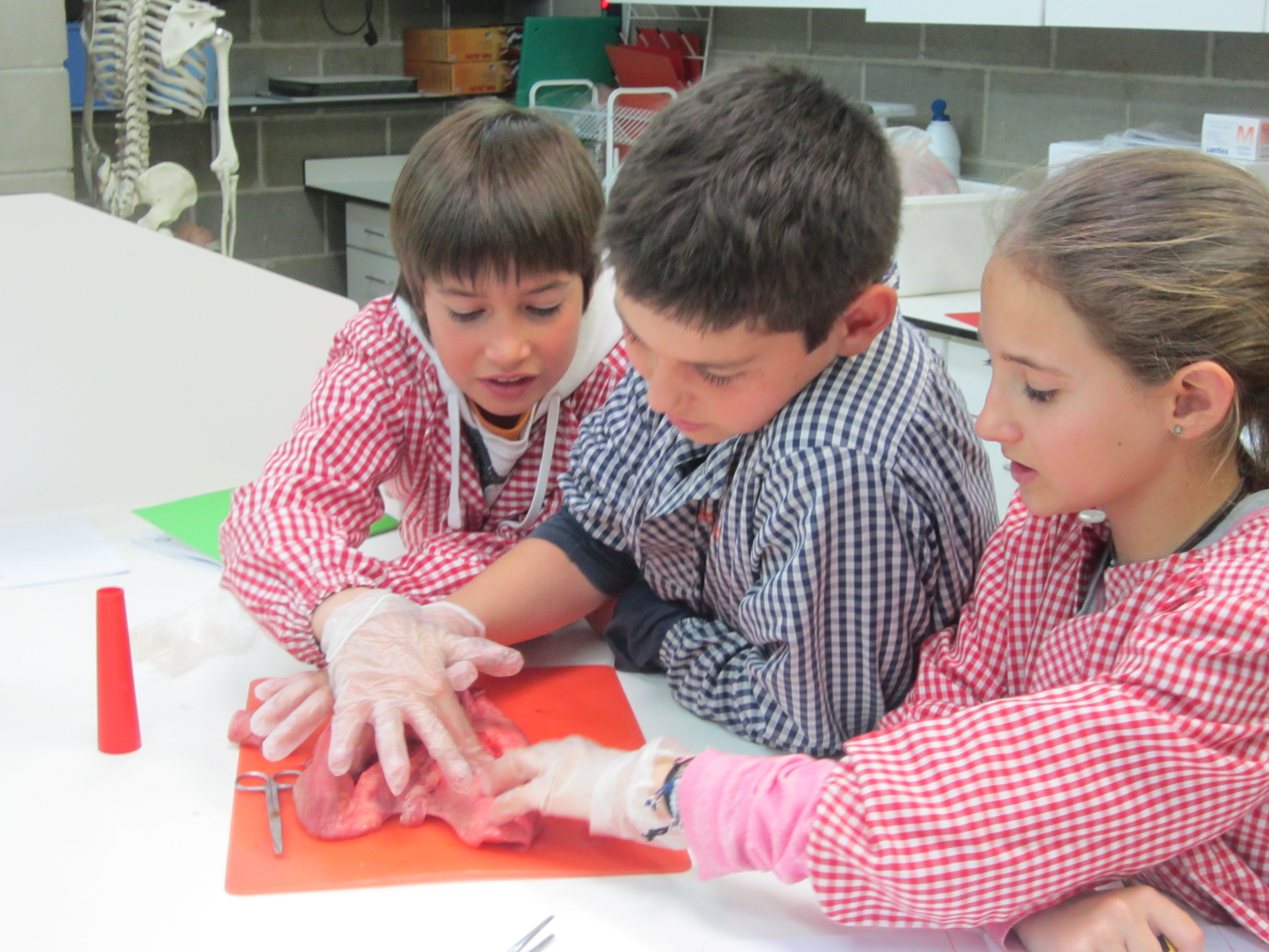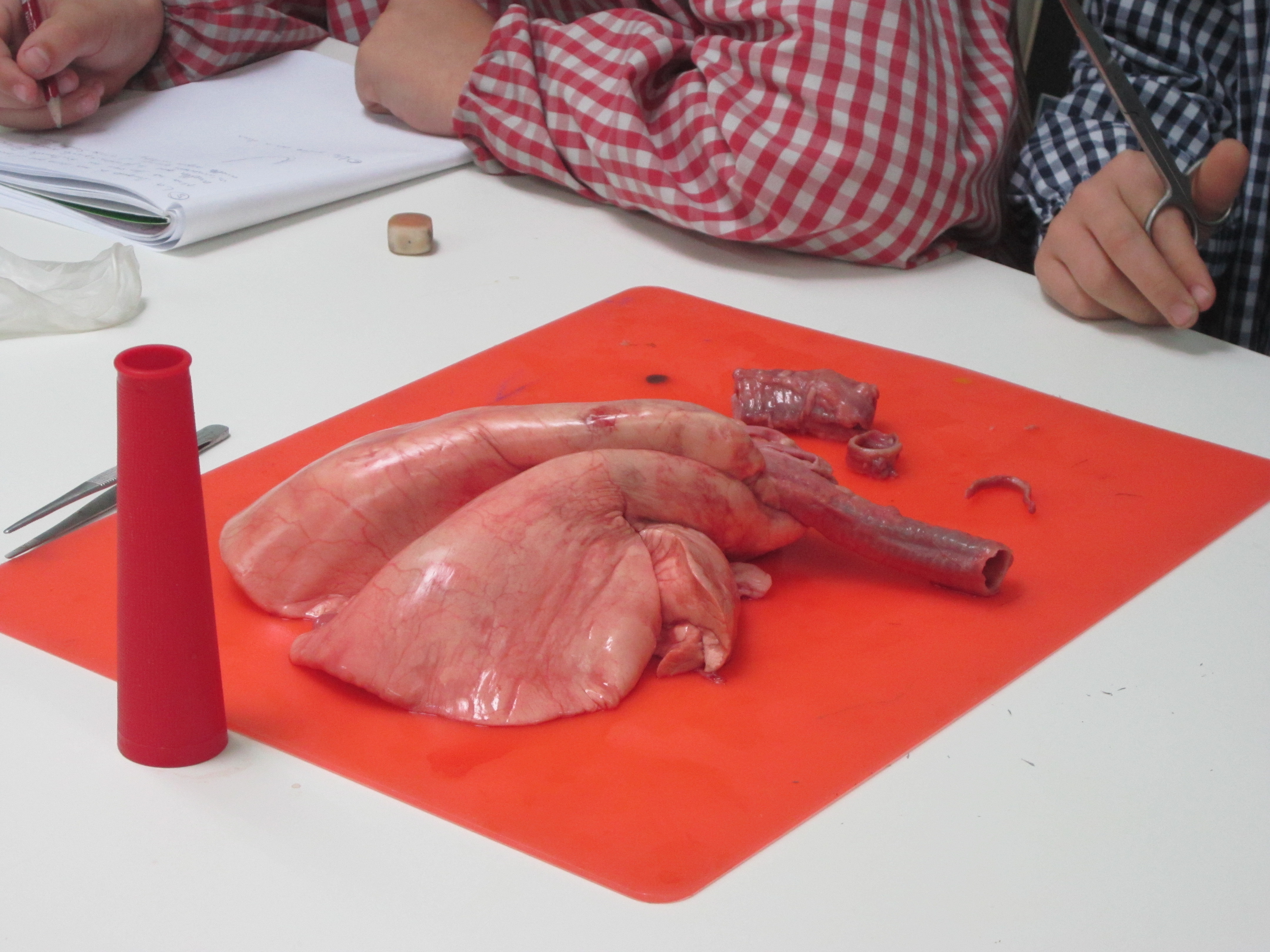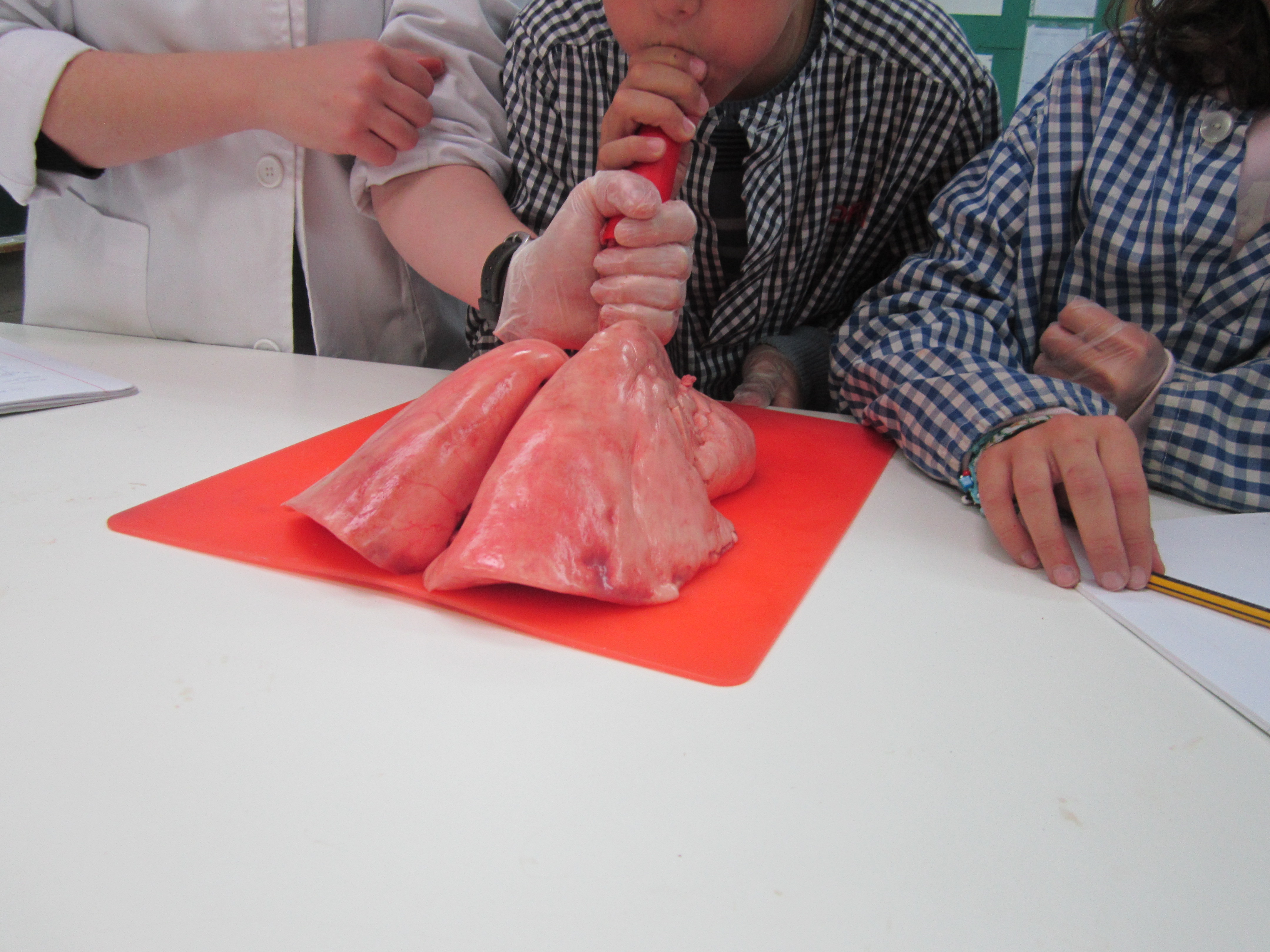Primer de tot la nostra mestra els hi va treure el cor. Els vam tocar amb els guants “làtex” i després els vam bufar amb un tub, vam tallar una anella de la tràquea i la vam observar: vam veure que totes les anelles estaven que estaven unides per greix, però en realitat són com una “U”.
