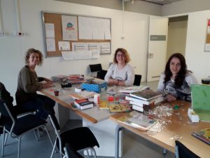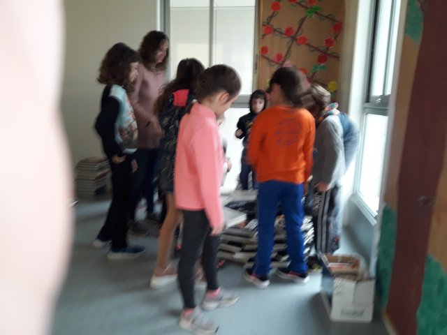 Aquesta tarda, la Sònia, l’Eli i la Isabel, mares i membres del nostre AMPA, han vingut a ajudar-nos a folrar llibres de la biblioteca.