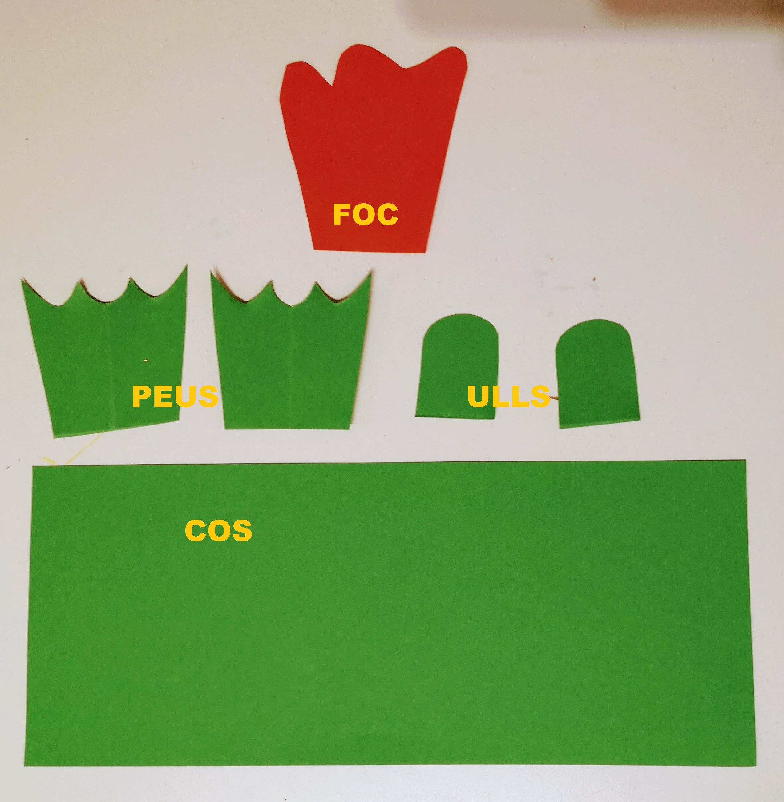 Decoreu les altres peces que han de ser els ulls, el foc i els peus. Si se us acudeix un altre cosa per afegir-hi, vosaltres mateixos! Quan ja ho tingueu a punt, és moment d’enganxar-ho tot: