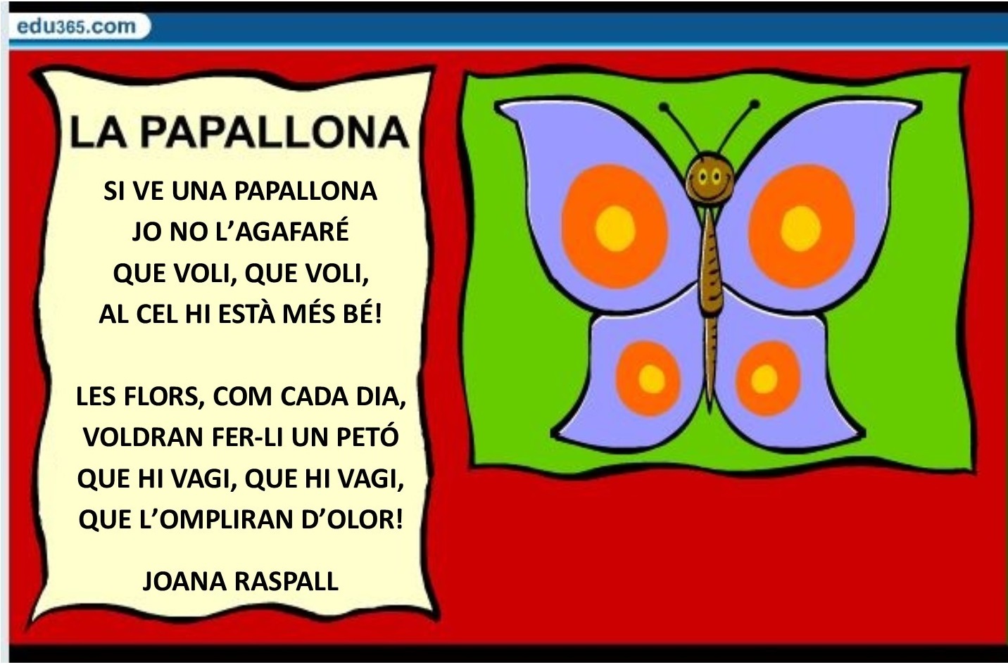 Dia 4: Mestra i alumne/a reciten el poema al mateix temps (tot i que misteriosament la mestra a estones s’oblida del text i deixa que sigui el nen/a qui reciti sol. És curiós la mala memòria que tenim les mestres ;P)