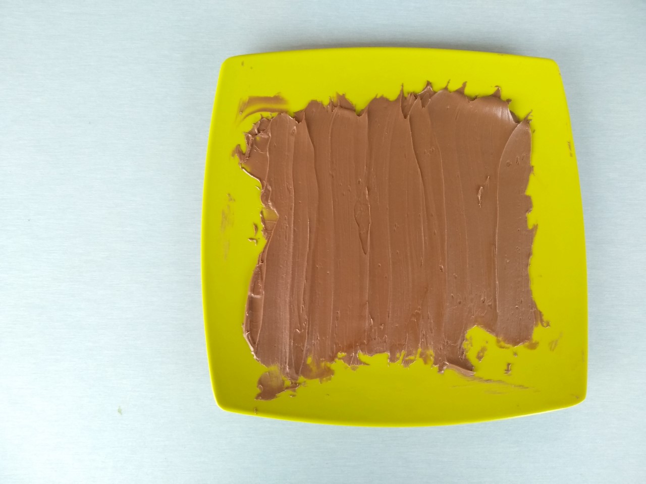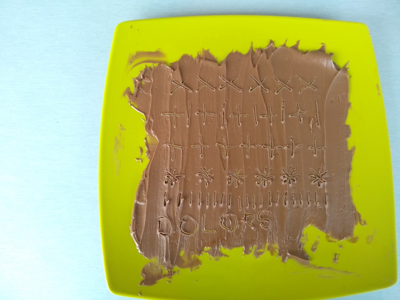 Es tracta de fer traços sobre una superfície de nocilla amb l´escuradent o el pal de pinxito,com es veu a les fotos.