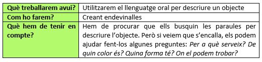 Ara és el vostre torn, busqueu alguna cosa per casa i l’amagueu que no la puguin veure. Penseu quines paraules serviran per descriure-la i a veure qui l’encerta! També li podem demanar a algú que ens la prepari i nosaltres l’endevinem i després l’escrivim en un paper.