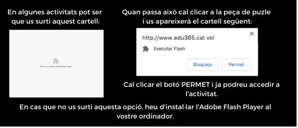 Algunes d’aquestes pàgines web no funcionen des de la tauleta o el mòbil, caldrà jugar-hi des de l’ordinador. Recomanem fer servir l’explorador Mozilla Firefox ja que mostra més compatibilitat amb activitats Flash.