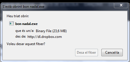 Hola a tothom, sembla ser que els vídeos de felicitació de Nadal no es poden veure correctament. Us deixem el link als arxius amb extensió exe. Són arxius executables, a clicar sobre el link sortira una finestra amb l’arxiu: