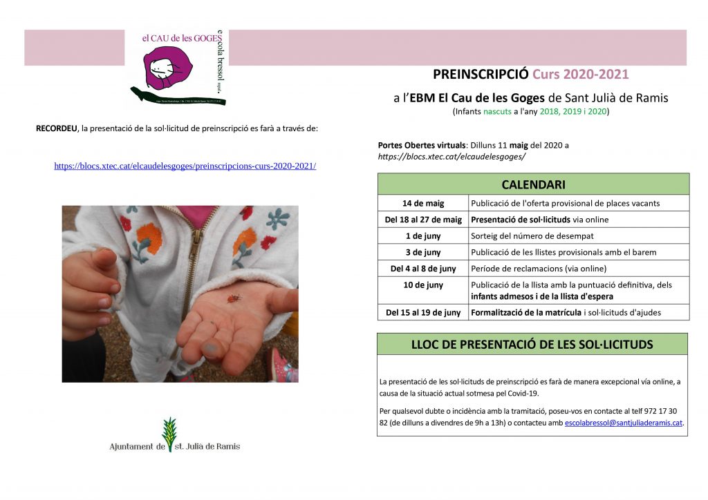 La presentació de les sol·licituds de preinscripció es fa de manera excepcional vía online, a causa de la situació actual sotmesa pel Covid-19.