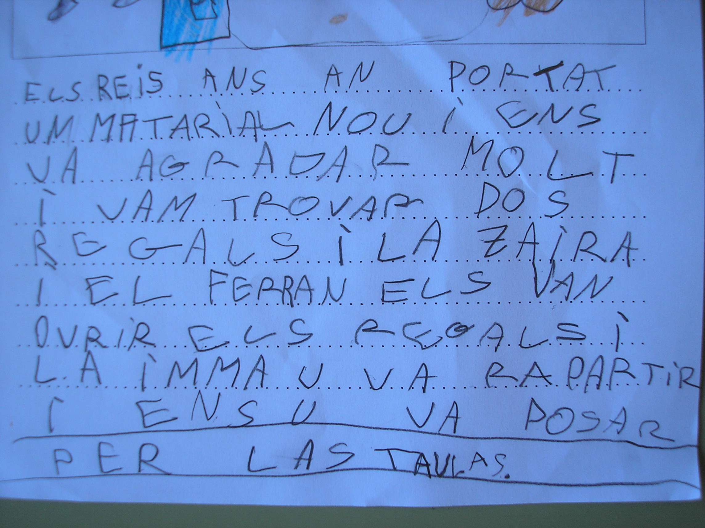 ELS REIS ENS VAN PORTAT UN MATERIAL NOU I ENS VA AGRADAR MOLT. VAM TROBAR DOS REGALS I LA ZAIRA I EL FERRAN ELS VAN OBRIR. L’IMMA HO VA REPARTIR I HO VA POSAR PER LES TAULES.